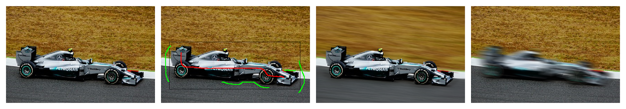 Motion blur appears in images as a visible trail along the motion path of the recorded object. It plays an important role in photography to convey a sense of motion but can be difficult to acquire as intended by the photographer. One solution is to add motion blur in a post process but current solutions involve much manual intervention and can lead to artifacts that mix moving and static objects incorrectly. In this paper, we propose a novel method to add motion blur to a single image that generates the illusion of a photographed motion. Relying on a minimal user input, a filtering process is employed to produce a virtual motion effect. It carefully treats object boundaries to avoid artifacts produced by standard filtering methods. We illustrate the effectiveness of our solution with various complex examples, including multiple objects, reflections and high intensity light sources. Our post-processing solution can achieve a convincing outcome, which makes it an alternative to attempting to capture the intended real-world motion blur.