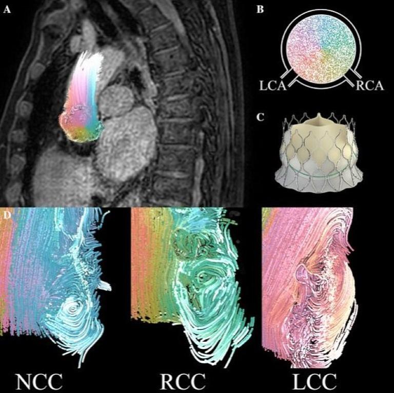 Novel nitinol, self-expandable, short bodied transcatheter aortic valve implantation (TAVI) prostheses allow for magnetic resonance imaging (MRI)-based evaluation of the left ventricle and aortic root, due to a relatively small susceptibility artefact. We have employed four dimensional (4D-)flow MRI-analysis in 3 patients, 2 years after uncomplicated TAVI with the new CENTERA prosthesis. Thoracic 4D flow MRI was conducted at 3.0T with a spatial and temporal resolution of 2.5 mm3 and ± 42 milliseconds. Vortex formation in the three sinuses of Valsalva was analyzed using advanced streamline techniques.