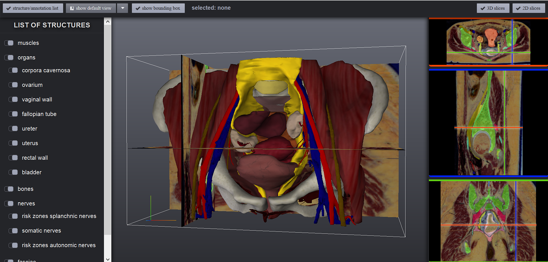 The Online Anatomical Human (OAH) is a web-based viewer for studying anatomy. It is based on real human anatomy and incorporates medical image data in linked 2D and 3D views that students can freely interact with. Our application is the only to support 2D and 3D views based on real medical imaging data. The main goal of this anatomical online resource is to serve as an educational platform available to anyone with access to a modern web browser. Users can annotate regions, add comments, and provide hyperlinks to additional media. By making our work accessible to medical experts, we can ensure an increasing amount of information, leading to an ever-growing gain in educational value. The OAH will be used in an upcoming Massive Open Online Course (MOOC) to teach anatomy of the pelvis and will be made available to students worldwide via the web.