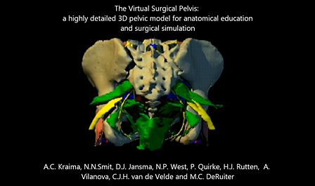 Background: The surgical anatomy of the pelvis is highly complex. In case of rectal cancer the surgeon is challenged to perform a total mesorectal excision (TME) warranting complete removal of the tumor and preservation of the autonomic nerves. However, incomplete TME specimens and surgical damage to the nerves are still part of clinical reality. A highly-detailed 3D pelvic model would be an excellent tool to increase anatomical knowledge of the surgical anatomy of the pelvis. Visible Human Datasets (VHDs) are often used to create a 3D model, but they lack anatomical detail such as autonomic nerves and fasciae. Immunohistochemistry is an ideal method to study those key surgical structures at microscopic level. Recently, the Unified Anatomical Human (UAH) has been developed. UAH integrates heterogeneous anatomical data and will allow registration of patient-specific diagnostic images. In this study, we describe the development of The Virtual Surgical Pelvis (VSP) and its potential clinical value in anatomical education and surgical simulation. Material and methods: We selected 910 slices from a VHD that comprised the entire pelvis. All surgically relevant anatomical structures were manually segmented using Amira� software and three-dimensionally reconstructed using the UAH. The Online Anatomical Human (OAH), an online web-viewer, was developed as well. Paraffin embedded mega blocks of 1 female cadaveric pelvic exenteration specimen were sliced in transverse sections of 5 �m. A series was stained with Hematoxylin & Eosin and Masson�s Trichome and selected sections were immunohistochemically stained with S100, a pan-neuron marker. The autonomic nerves and fasciae were manually segmented in Amira� software, three-dimensionally reconstructed and integrated using the UAH. Results: Currently, the VSP presents most of the essential surgical anatomy of the pelvis, including the levator ani muscle and pudendal nerve, and can be interactively visualized in the UAH and OAH. Microscopic analysis of the female cadaveric specimen reveals the organization of autonomic nerves and fasciae in relation to pelvic organs. Conclusion: The VSP showing the complex pelvic anatomy is a potentially excellent tool for anatomical education. Registration of the VSP to patient-specific diagnostic images allows visualization of key surgical structures such as autonomic nerves and fasciae in relation to pelvic viscera. This makes surgical simulation a nearby future goal for all pelvic surgeons.