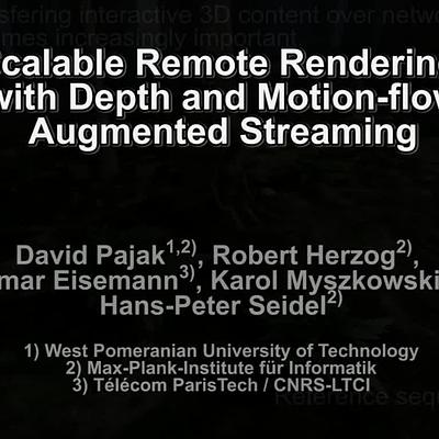 In this paper, we focus on efficient compression and streaming of frames rendered from a dynamic 3D model. Remote rendering and on-the-fly streaming become increasingly attractive for interactive applications. Data is kept confidential and only images are sent to the client. Even if the client’s hardware resources are modest, the user can interact with state-of-the-art rendering applications executed on the server. Our solution focuses on augmented video information, e.g., by depth, which is key to increase robustness with respect to data loss, image reconstruction, and is an important feature for stereo vision and other client-side applications. Two major challenges arise in such a setup. First, the server workload has to be controlled to support many clients, second the data transfer needs to be efficient. Consequently, our contributions are twofold. First, we reduce the server-based computations by making use of sparse sampling and temporal consistency to avoid expensive pixel evaluations. Second, our data-transfer solution takes limited bandwidths into account, is robust to information loss, and compression and decompression are efficient enough to support real-time interaction. Our key insight is to tailor our method explicitly for rendered 3D content and shift some computations on client GPUs, to better balance the server/client workload. Our framework is progressive, scalable, and allows us to stream augmented high-resolution (e.g., HD-ready) frames with small bandwidth on standard hardware.