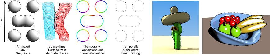 We describe a method to parameterize lines generated from animated 3D models in the context of animated line drawings. Cartoons and mechanical illustrations are popular subjects of nonphotorealistic drawings and are often generated from 3D models. Adding texture to the lines, for instance to depict brush strokes or dashed lines, enables greater expressiveness, e.g. to distinguish between visible and hidden lines. However, dynamic visibility events and the evolving shape of the lines raise issues that have been only partially explored so far. In this paper, we assume that the entire 3D animation is known ahead of time, as is typically the case for feature animations and off-line rendering. At the core of our method is a geometric formulation of the problem as a parameterization of the space-time surface swept by a 2D line during the animation. First, we build this surface by extracting lines in each frame. We demonstrate our approach with silhouette lines. Then, we locate visibility events that would create discontinuities and propagate them through time. They decompose the surface into charts with a disc topology. We parameterize each chart via a least-squares approach that reflects the specific requirements of line drawing. This step results in a texture atlas of the space-time surface which defines the parameterization for each line. We show that by adjusting a few weights in the least-squares energy, the artist can obtain an artifact-free animated motion in a variety of typical non-photorealistic styles such as painterly strokes and technical line drawing.