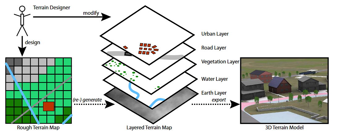 Manual game content creation is an increasingly laborious task; with each advance in graphics hardware, a higher level of fidelity and detail is achievable and, therefore, expected. Although numerous automatic (e.g. procedural) content generation algorithms and techniques have been developed over the years, their application in both games and simulations is not widespread. What lacks is a unifying modeling framework that combines these techniques in a usable manner. We propose to develop a new, high-level framework for automatic generation of virtual worlds (e.g. game levels, simulation terrain) that requires intuitive user input and results in a rich 3D terrain model.