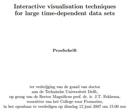 The research described in this thesis was part of a larger research project about multi-phase flows, in cooperation with researchers from Fluid Mechanics and Numerical Analysis. Multi-phase flows are characterised by a sharp transition between the fluids, the so-called phase front. There is no mixture between these fluids, therefore the transition from one fluid or phase to another is sharp and coincides with large jumps in physical quantities such as density and viscosity. One of the goals of the project was to study the evolution of the phase fronts using CFD, i.e. to study the development of the surfaces over time and to understand how they change and interact with each other. In order to study the evolving fronts, methods were needed for detecting and extracting them in the first place, and subsequently for tracking the phase fronts over time, and finding a way to visualise them interactively. Initially, feature extraction and tracking techniques were studied for this. However, after about a year into this project, it became apparent that the numerical method that was to be used for the simulation could provide an implicit surface representation of the phase front. This surface could easily be extracted from the data as an isosurface. Therefore, the research into feature extraction techniques was abandoned at that time and the focus of the research was redirected towards efficient techniques for interactive isosurfacing from very large time-dependent data sets. Fast-access data structures that were designed to perform one particular visualisation task efficiently were examined first. These data structures make use of the properties of a particular visualisation algorithm and are made to fit the algorithm closely. One such data structure was explored in detail: the temporal index tree, in combination with the interval tree. The interval tree was designed for very fast isosurface cell selection. This data structure is combined with a temporal index tree that makes use of data coherence in time to compress the data set in this dimension. The combined application of these data structures results in high speed isosurface cell extraction from time-dependent data sets. The extraction algorithm was combined with a special-purpose fast direct-rendering algorithm in order to prevent the rendering from becoming the bottleneck. The advantage of data structures like these is that they are designed to perform a particular visualisation task very fast. However, the drawback is that they are also limited to perform only that visualisation task. For extracting isosurfaces from time-dependent data sets, the index tree works very well, but the resulting visualisation cannot be combined with another type of visualisation. The data is stored in such a way in the index tree, that only isosurface cells can be extracted from it. The original, raw data set is not available, so the isosurface cannot be coloured with another scalar, or combined with streamlines, for example. The second approach that was explored is the use of multi-resolution data struc- tures. These structures enable the data to be accessed at several levels of resolution. The original data can be retrieved, but if available time or memory is limited, a lower resolution version of the data can also be requested. Whatever resolution is used, raw data is returned, which means that the visualisation is as flexible as in the original data. Unlike the fast-access data structures described above, (most) multi-resolution structures are not designed for one specific visualisation algorithm. This is a large difference between the two approaches, and a huge advantage of the latter. A multi-resolution data structure provides the flexibility to switch between different visualisations and is designed to handle large data sets by trading off data resolution for speed. There are many different ways to create a multi-resolution data structure. The method that was implemented in this project reorders the data in such a way that low resolution (subsampled) data is at the front of the data set and data points from consecutive higher levels of resolution are stored consecutively on disk. This has a number of advantages. First, there is no data replication, so the size of the multi-resolution data set is the same as that of the original data set; there is no spatial overhead. Secondly, data points from a single level of resolution are stored coherently on disk and therefore cache-friendly. Thirdly, because the data is merely reordered, lower resolution data is part of the higher resolution data. This means that the lower resolution data can be reused and less data has to be read when increasing the resolution. The fact that the low resolution data is only a subset of the high resolution data is also a disadvantage: if the data would be downsampled (filtered) instead of subsampled (unfiltered), less information would be lost in the lower levels of resolution, resulting in the data and visualisation being more smooth. The multi-resolution approach was extended to time-dependent data sets. Techniques for region-of-interest selection and time-window management were added to provide interactive visualisation and space-time navigation of these large 4D data sets.